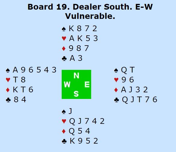 Om man skal være helt ærlig er 7 ruter litt vel hardt, men storslemmen har bra sjanser! Og å se at vests kort mot en 1NT åpning er slemkort er bra vurdert.