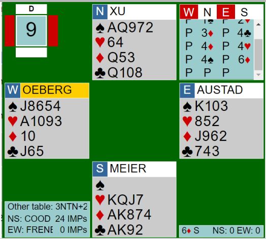Ved det andre bordet åpnet nord med 4 spar som en normal person. Syd var ikke med til 5 spar. Mine lagkamerater som var klart bedre enn oss i grunnspillet var skuffet over sin avgjørelse i dette spillet siden de frivillig meldte seg opp i 6 kløver som gikk en bet, +100. Men denne gangen ga det 14 IMP inn med resultatet fra vårt bord som vi leverte sammen med en «crazy» historie.