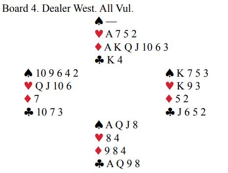 De som noterte +1370 hadde imidlertid ingen grunn til bekymring. Ved det andre bordet spilte N/S utgang, 5 ruter. Dvs. å melde lilleslem og få tolv stikk var verd 13 IMP.