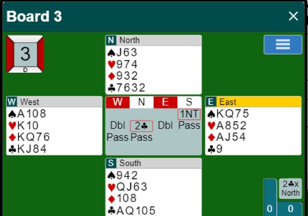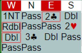 Herland-Skimmeland spiller med «kløverføringer». Så nords 1 ruter viste hjerterfarge, og syds 1 hjerter viste slik de spiller tre eller fire hjertere. Skimmeland ble optimistisk da syd var med til 3 hjerter selv om han vet syd har 11-13 balanserte, og han løftet til en hardmeldt utgang.