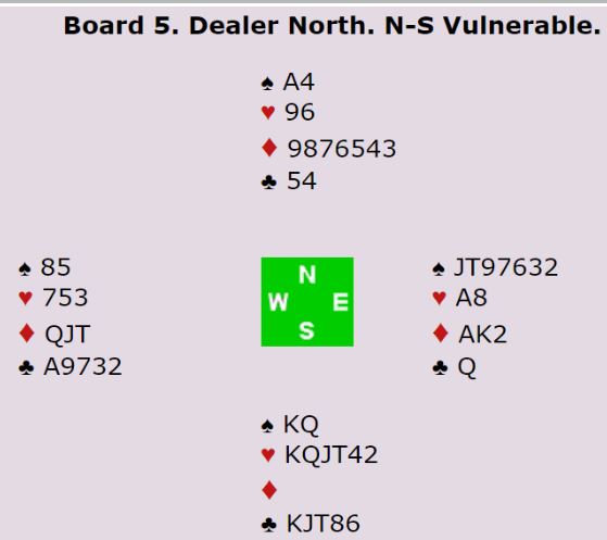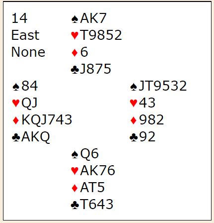 Dette er et såkalt «begrenset valg» hvis man ser på hjerterfargen isolert sett. Det tilsier finesse når en honnør kommer på bak, men slike regler må ikke følges slavisk. Vest hadde doblet opplysende, og det er ganske vanlig at man heller melder inn med gode kort, lang ruterfarge og singelton i en major heller enn å doble opplysende. Unntaket er om man er supersterk, da dobles først.