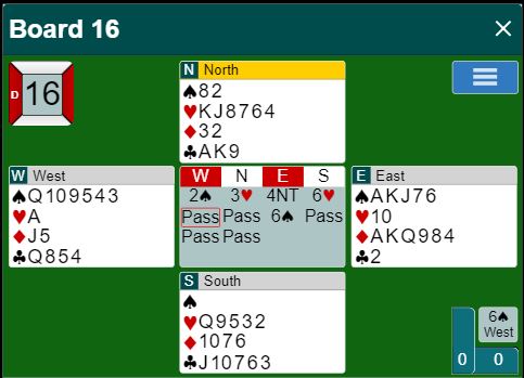 Ved det andre bordet hoppet den norske vest til 3 spar over syds åpning 1 kløver. Jeg vet ikke parets stil, men om 3 spar er sperremelding i systemet deres mener i alle fall jeg at hånden er alt for spillesterk for en slik melding. Men å hoppe innpå setter normalt press på motparten hvis det er de som har kortene, noe som dog kan slå begge veier. Her slo det på en måte galt ut selv om N/S for såvidt gjettet feil.