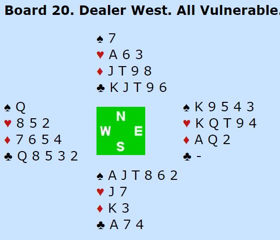 Ved det andre bordet meldte nord 2 kløver i balanseringsposisjonen. Helge Homme (øst) meldte 2 hjerter før N/S endte i 3 kløver som de vant akkurat til tross for den stygge trumfsitsen. Med -110 ved det bordet og +800 fra lagkameratene ga spillet 12 IMP til Norge.