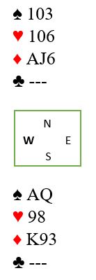 Nå spilles altså spar ess og spar dame, og som allerede sagt er det ingen problemer om øst vinner med spar konge. Men som du ser vinner vest det stikket, og han må spille ruter. Med liten ruter fra vest får du med denne kombinasjonen hos N/S to sjanser ved å legge liten fra nord. På ruter fra vest og sekseren fra nord må øst på med damen slik det her sitter, og da står jo A-J. Det er ruter 9 som er så viktig. Men kanskje produserer øst ruter 10 i det stikket. Da stikkes med kongen, og da må ruterfinessen prøves. Det hjelper selvsagt ikke om vest spiller ruter 10 idet han er inne på spar konge, for da dekkes simpelthen med knekten, og nieren blir god.