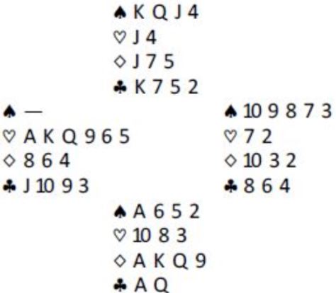 Du skal i lagkamp spille 4 spar som syd, og motparten har ikke meldt. Vest spiller ut hjerter konge og fortsetter med liten hjerter til østs ess. Derfra kommer en tredje runde hjerter som du stjeler, for sikkerhets skyld høyt selv om du ikke har tro på at øst har sekskort hjerter og øst dobbelton, men du har jo alt av store trumf uansett. Vest følger (naturligvis) farge i tredje hjerterrunde. Du tar en trumfrunde, og begge følger farge.
