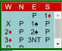 Ved det andre bordet satt Geir Brekka syd og Øyvind Saur nord. Også der doblet vest syds åpning 1 ruter. Brekka-Saur spiller med ekte 1 ruteråpning. Derfor kunne Saur hoppe til 3 ruter med nords kort - sperremelding. Det satte mer press på Ø/V. Det gikk pass, pass før vest doblet igjen. Da sa øst 3 spar, og de endte i 4 spar etter dette meldingsforløpet:
