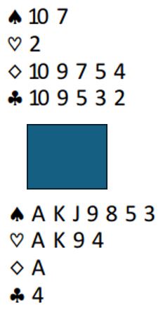 Makker hadde jo noen verdier til deg selv uten honnørpoeng med en singelton og to trumf. Men hvis du spiller rett etter nesen og denger ned hjerter ess går det galt hvis det sitter slik fra start, en ganske sannsynlig sits slik meldingene har gått: