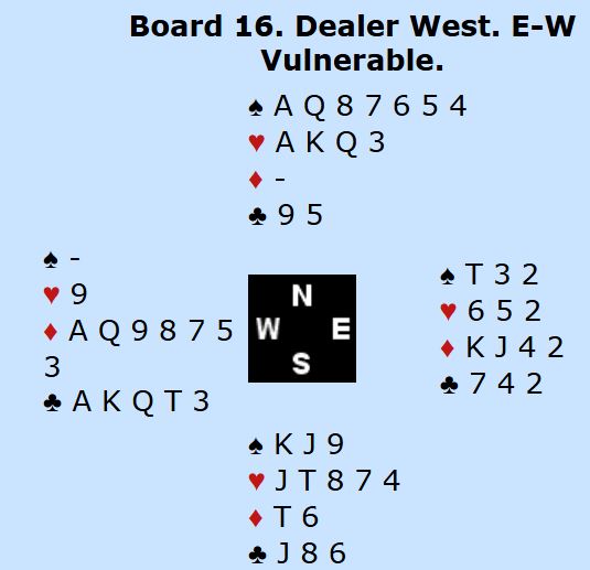 Disse kortene så ut til å ha vært gitt med bokserhansker som man sier. Ø/V har 6 ruter i kortene. Så det var faktisk N/S som stampet i dette tilfellet uten at noen spillere visste det ved ett eneste bord...