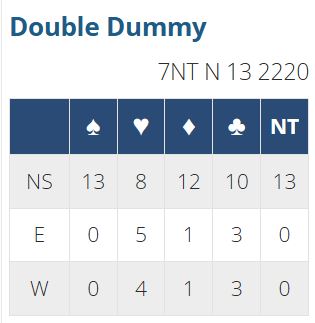 Som flere ganger nevnt her i bloggen må man ikke se på slike computeranalyser som sannheten om hva som bør meldes, eller at antall stikk som er maks er de stikk man bør ta. Det kan ofte være helt hårreisende spilleplaner som må til for å oppnå maks, kanskje å spille helt mot oddsen, og det kan også være at det sitter veldig fordelaktig sånn at prosentsjansen for å vinne alle de mulige stikkene egentlig er veldig liten. Husk at disse analysene er med åpne kort. Datamaskinen vet hvor alle kortene sitter, og da er det mye enklere enn om man må gjette på ting.