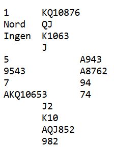 I dag får du et spill jeg leste om i et gammelt bridgemagasin for en stund siden. Siden jeg ikke kunne finne igjen det bladet er kort-diagrammet konstruert etter beste evne, og om ikke alle kortene er helt korrekte er i alle fall spillets poeng korrekt.
