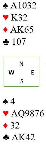 Et annet lite poeng er hjerterfargen om en ser isolert på den. For å spille en sånn farge best mulig for å unngå taper bør normalt kongen spilles først. Sitter det 3-1 eller 2-2 er det uinteressant med hensyn til antall stikk i fargen, det blir alltid seks stikk med en sånn farge da. Men det kan sitte 4-0. Den eneste 4-0 sitsen en kan takle med denne hjerteren er alle fire hos øst. Kongen avslører i så fall sitsen, og en dobbelfinesse over J-10 fjerde kan tas med A-Q-9 hos syd bak den med alle fire uteværende hjertere. Men det er som sagt teknikk og fargen isolert sett. I dette spillet må det trumfes kløver(e) hos nord og da faller det med fargebehandling for å takle 4-0 sits bort i dette tilfellet.