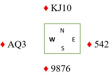 Men vi tenker oss at syd i innspill-situasjonen kommer på med damen eller kongen i hjerter over østs knekt. Da trumfes hos vest og spillefører må tippe litt. Om syd har ruter konge har han den hele tiden, og vi kommer til å vinne denne slemmen uansett. Men nå kan en spille på en av to sitser som gir kontrakt selv om nord har ruter konge. Du kan satse på at det så omtrent slik ut fra start: