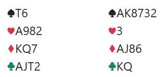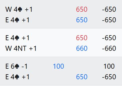 Bakke gikk for en nokså sikker utgang, mulig slem. Så han sa 2 spar over vests 1 spar, overmelding av motpartens farge. Det benekter lang ruter- eller hjerterfarge, og han har heller ikke firekorts hjerter siden han med det ville doblet negativt. Så 2 spar viser gode kort og kløverfarge, og de fleste bruker en sånn overmelding som minst invitt til utgang. Brogeland som ikke hadde vist kløverfarge med åpningen 1 kløver likte å høre at nord satt med kløverfarge, for da ble minimumshånden sterkere enn først antatt. Han sa 3 spar - antagelig avtalt som singelton. Bakke kunne liksom ikke gjøre noe annet enn å si 3NT over det, men Brogeland likte tanken på kløverkontrakt så godt at han tok ut i 4 kløver. Det fulgte noen cuebids før de havnet i 6 kløver som er en glimrende slem. Vest fant beste utspill, ruter. Men to runder kløver viste at det ikke var trumftaper. En ruter forsvant fra nord på hjerteren, og det var ingen problemer med å vinne alle tretten stikkene, N/S +1390. Om kløver dame hadde sittet tredje ville det selv etter det beste utspillet sett fra forsvarets side blitt vunnet slem om den med tre kløvere følger minst to ganger hjerter slik at spillefører rekker å bli kvitt en ruter fra nord.