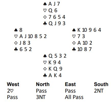 Med ingen i sonen åpnet vest som giver med svake 2 hjerter, definert som 5-10 poeng og sekskorts farge, Det gikk to ganger pass før syd sa 2NT som nord løftet til 3NT.