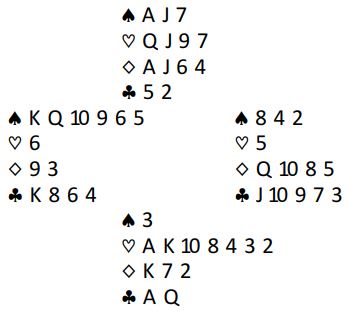 Med alle i sonen og syd som giver åpnet syd med 1 hjerter før vest hoppet inn med 2 spar (svakt innhopp). Nord meldte 3 spar som var definert som en god 4 hjertermelding. Det endte i 6 hjerter. Omtrent sånn gikk meldingene ved mange bord. Mange par kom altså i 6 hjerter, men spilleføringen gikk på ingen måte likt rundt omkring i salen.