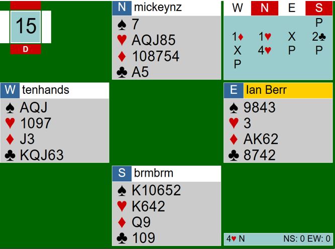 Vel, hvis sparen sitter 4-2 kan det den femte sparen godspillles så har man 4+3-2+2=11 og mulighet for det tolvte ved hjelp av skvis, snill hjertersits, eller kløverfinesse. Kløverfargen kan gi ett (eller to) ekstra stikk, og ruter 10 kan også ha betydning.Men man har jo ikke råd til å gi bort to stikk...