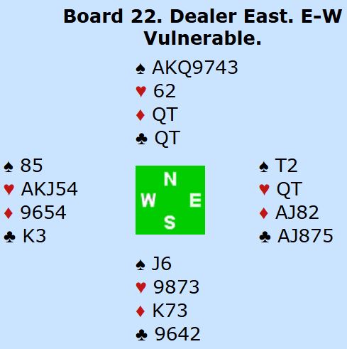 Etter dette hadde spillefører to sparstikk, tre hjerterstikk og fire ruterstikk, ni stikk totalt og +400.