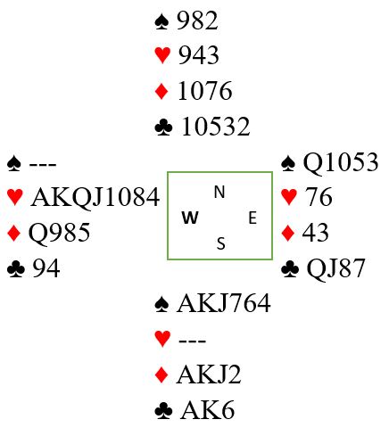 I hjerterkontrakt er det kun en taper i trumf og en i kløver i tillegg til at det blir bare en spartaper, for fra vest kan en spar kastes på ruter konge. Kun ett par var i 4 spar. De vant den etter hjerter ess i utspill som gjorde at N/S ikke fikk kløverstikk, det var inntak til øst for å hente ruter konge og kaste kløver fra vest. Om det spilles ut kløver får ikke spillefører kommet seg over for å tatt det avkastet. Det var en lang rekke +620 i hjerterutganger, og det ga middels. Noen få par fikk fatt i ett overstikk og noterte med det 60%. Ett par fikk 70% for +660 i 3NT, en kontrakt som er håpløs om det kommer kløver ut.