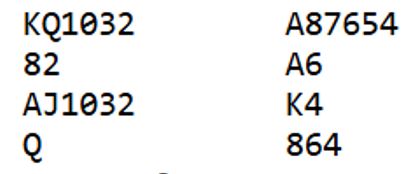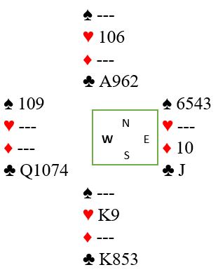 Uforståelig nok, vest spilte ut ruter 7 (norsk fordeling) ved det bordet også. Det gikk ruter 9, 10 og konge fulgt av spar ess og mer spar til vests konge. Det kom nok en ruter (!) til esset. Rutersitsen var nå på det nærmeste klar uten at det hjelper noe, det ser uansett ut til å være fire uungåelige tapere. Vest må ha rutersyveren dobbel, for om han hadde startet med fire ruter ville utspillskortet - syveren - vært det nest høyeste kortet. Inne på ruter ess ble kløver 10 spilt til vests ess. Han spilte mer kløver til østs konge. Ingen ting som koster noe har egentlig skjedd så langt, og de vil fortsatt få ett hjerterstikk mot slutten - betestikket - ikke sant?