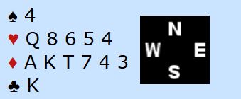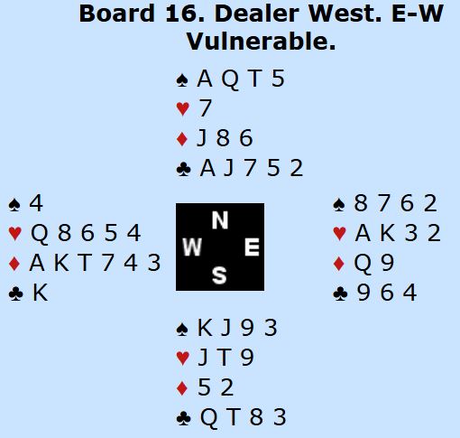 Om en ser bare på N/S sine kort er det bare tre tapere. Men 4 spar kan betes og det kan sogar bli flere bet om motspillet sitter. Selv med ruter ut bør det bli det minst en bet. Spillefører går på trumfen, men da kan vest skifte til hjerter ess og mer hjerter. Øst trumfer og spiller kløver ess og kløver til trumf hos vest – to bet. Om vest skulle finne på å spille ut hjerter ess kan forsvaret få full uttelling. To stjelinger hos øst med hjerterspill hver gang vest er inne, to stjelinger hos vest med kløverspilling fra øst samt tre ess = syv motspillstikk! Men selv med fire mulige bet i 4 spar pga. den spesielle sitsen er det helt naturlig å være med til 5 ruter som Ø/V.