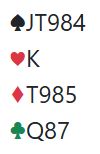 Her viser øst sitt hopp til 4 kløver firekorts trumf og singel kløver. Nå vet vest at de skal til 6 eller 7 hjerter og kan like godt spørre med det samme om nøkkelkortene (essene, trumf kongen og trumf damen), helst med 4 spar som Exclusion Key Card Blackwood siden spar ess antagelig ikke er så interessant. Det mangler ikke nøkkelkort, men trumfdamen mangler. Det kan vel likevel være fristende å satse på 7 hjerter som mest sansynlig avhenger kun av at trumfen ikke gir taper?
