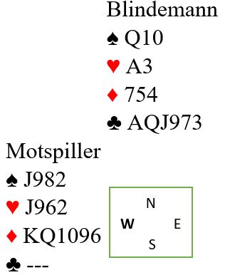 Nå er det safe å godspille ruteren, og om makker kommer inn, for eksempel på kløver konge vil han ha en ruter igjen til å spille deg inn med. Så dette blir vel kjempebra for oss? For spillefører må vel ha A-J dobbel i ruter? Vel, etter å ha fortsatt med stor ruter til esset i andre stikk vil du få en ubehagelig overraskelse noen få sekunder senere!