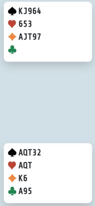 Hoftaniska - Charlsen meldte kontrollert, og de fant rutertilpasningen på tre-trinnet. Da meldte Hoftaniska (øst) 3 hjerter for å finne ut mer, og Charlsen sa 3NT. Med ekstra styrke gikk øst videre med 4 kløver. Da vest meldte 4 hjerter doblet nord. Doblingen var ikke helt heldig, for det ga litt hjelp til det norske paret. For nå så de faremomentet med å ha øst som spillefører, hjerter fra syd truer. De endte derfor i 6NT, en perfekt slem så lenge vest er spillefører sånn at hjerter konge er beskyttet. Det var ingen problemer i spilleføringen i 6NT av vest, det er jo 1+0+5+6 = 12 sikre stikk,  DE BOTTON +990.