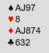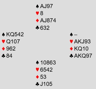 Klukowski - Kalita (Zimmermann) hadde større ambisjoner og endte i 7 hjerter! Det er egentlig ganske hårreisende da storeslem er elendig. 7 hjerter er avhengig å unngå rutertaper og litt til! Men det er ikke sjanseløst. Hvilke muligheter er det for å unngå rutertaper, og hvordan bør ruteren spilles?