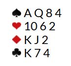 Om syd åpner med denne litt rustne 11-poengeren kan nord bli sleminteressert. Hvis ikke blir det normalt utgang i kløverkontrakt, eller 3NT.