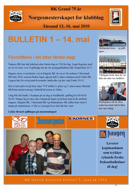 Namsos har fått opp dampen etter en litt ujevn første kamp og tatt teten etter de 2 første kampene. Første kamp var mot TopBridge. Denne kampen vant Namsos knepent 16-14. Noen tabber ødela for en større seier i den kampen. Davidsen - Nybo, Enge - Flått/Ringseth spilte første kamp. Frode Nybo i aksjon mot Nils-Otto Eliassen i TopBridge. Nils-Otto holdt ord når han sa han skulle være snill med Namsosgutta Kamp 2 var mot arrangørklubben Grand BK. En jevn første halvrunde ble fulgt av solid bridge fra begge par. Kampen ble til slutt vunnet klart 23-7 og Namsos har allerede fått en luke på 6VP ned til andreplassen. Butleren taler sitt tydelige språk etter 2 kamper. Frode og Ragnar er klart i tet med godt over 1 IMP i snitt pr spill. Det er langt ned til de neste på den lista. Ragnar og Frode har etter eget sigende spilt j... bra til nå. Vi håper det fortsetter En måpende Ragnar har tydligvis ikke pokerfjeset i orden Resultater finner du her På turneringens hjemmeside finner du bulletiner og bilder I morgen tidlig 09:00 spiller Namos mot Førde på BBO